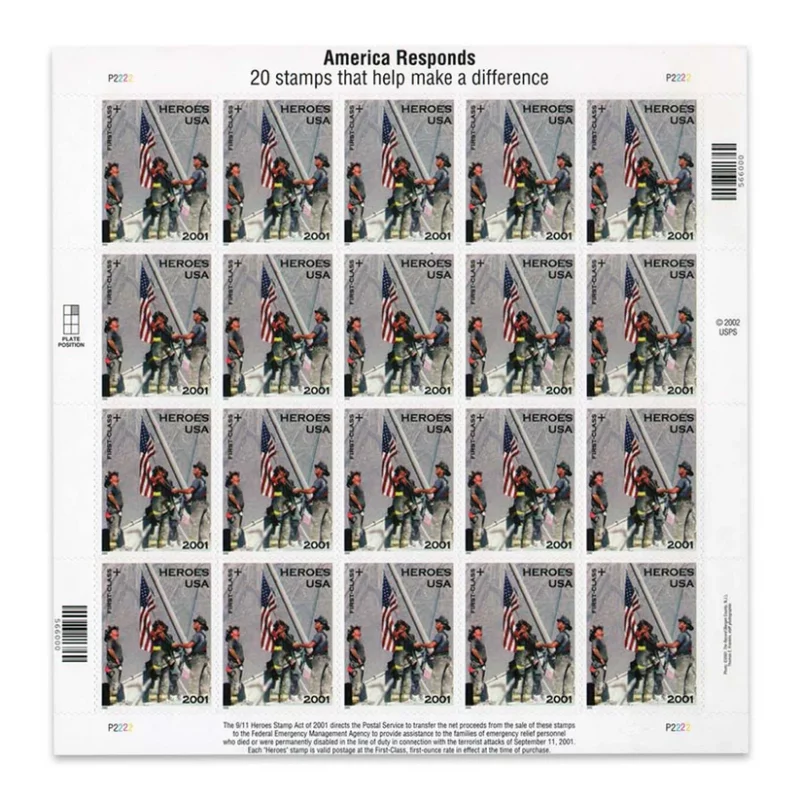 In the aftermath of September 11th, the U.S. Postal Service produced a semi-postal stamp which raised money for families affected by the terrorist attacks. It celebrated the heroism of America’s first responders and the resiliency of the nation by featuring the iconic image of three firefighters raising the American flag amid the rubble of the World Trade Center. This intact sheet of 20 stamps is a wonderful way to remember the heroes of 9/11.