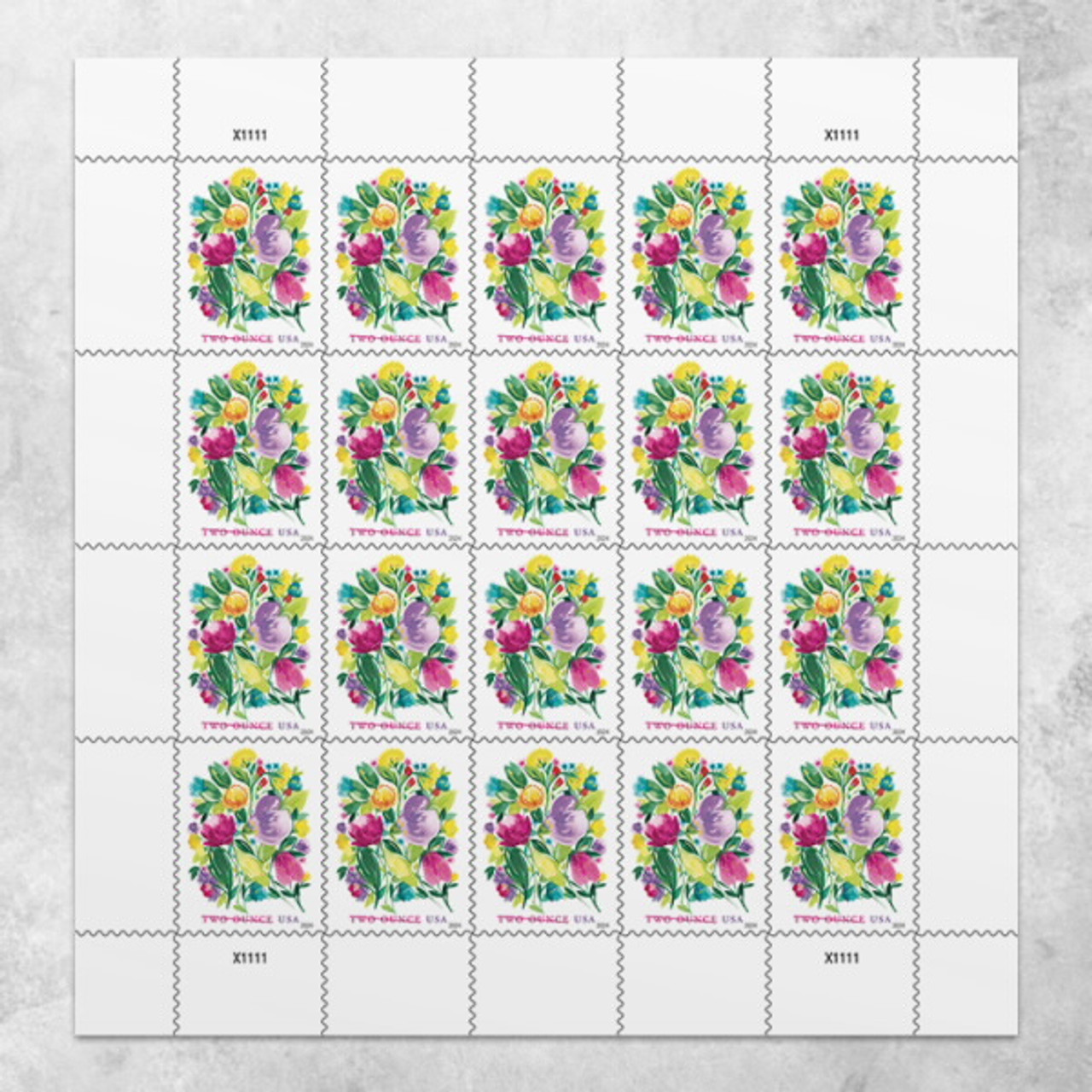 This charming stamp can accommodate the weight of heavy invitations for birthdays, weddings, anniversaries, and other celebrations; greeting cards for all occasions; and mailings such as small gifts that require extra postage. The Wedding Blooms two-ounce stamp is similar in design to the Celebration Blooms Forever? stamp, and the two form a natural pair.