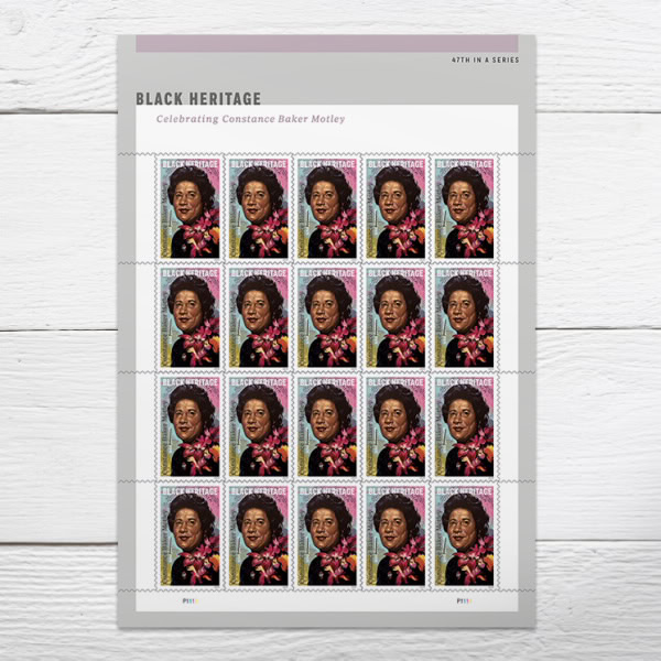 Honor a civil rights pioneer and the first African American woman known to have argued a case before the United States Supreme Court with the new Constance Baker Motley stamp from the U.S. Postal Service. The 47th stamp in the Black Heritage series depicts a portrait of Motley by Charly Palmer rendered in acrylic on canvas.