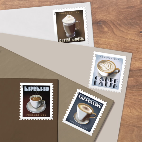 This booklet of 20 Stamps features four unique designs illustrating popular espresso drinks??espresso, cappuccino, caffe latte, and caffe mocha. Capturing the inviting atmosphere of an early 20th-century caf??, each digital illustration was created with the style of 1920s and 1930s advertising posters in mind. The names of the espresso drinks appear in art deco-inspired lettering above or below each enticing cup.
