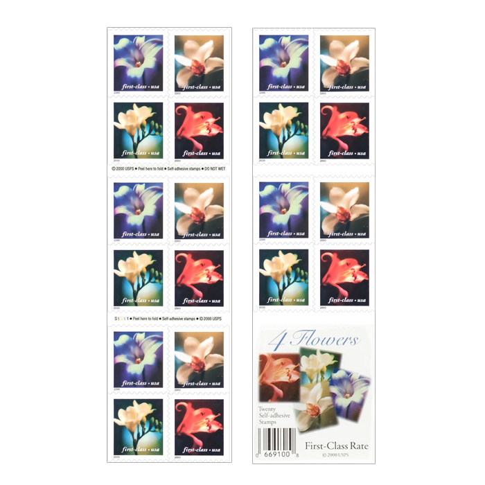 The four flowers photographed on this mint booklet pane are Freesia. Cymbidium Orchid. Longiflorum Lily. and Asian Hybrid Lily. This was the first time photos of flowers were used instead of illustrations. These non-denominated 34?? stamps were issued in self-adhesive format in anticipation of the 2001 first class rate increase. Stamps are on both sides of the booklet.