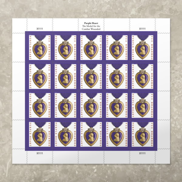 The Purple Heart Medal 2019 stamp is a redesign of the 2012 Purple Heart Medal stamp and features a purple border matching the